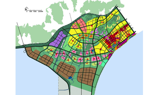 古雷半岛位于福建省漳州市南部海峡,拥有天然深水避风良港以及多条区域交通走廊横贯半岛的交通优势,是海西经济区发展建设的重点区域。规划以构建古雷“生态城”(Eco-city)为核心理念,针对古雷半岛发展面临的生态环境保护、化工污染隔离、空间发展方向、主导产业选择等问题提出包括“生态、水环境、交通、能源、产业、活力城市”六大子战略在内的生态城可持续发展战略支撑体系。用地布局结合基地自然本底,创新性的提出布局“生态功能过滤带”方式消解污染影响,并结合主导风向与河流水系规划生态廊道,形成覆盖全城的生态网络。CBD城市设计以塑造“慢节奏、健康绿色”的新型城市中央商务活动区为目标,建筑设计以灯塔、帆船、海浪为元素,突出海滨城市特色。连接标志性建筑的空中漫步连廊打破了过去停留于地面层的步行交通流线,形成立体化的步行网络。设计将绿地公园与建筑设计相结合,使E-CBD成为生态城各项生态技术落实的示范展示地。